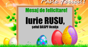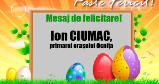 Stimaţi şi dragi locuitori ai oraşului Ocniţa! E atâta lumină în jur, pentru fiecare dintre noi. Lăsăţi lumina să intre în casa sufletului Dvs şi să vă simţi cu adevărat împliniţi. Fie ca lumina Învierii Mântuitorului să vă inunde casa şi să vă aducă numai armonie, fericire şi multă iubire. …
