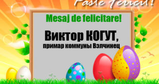 Уважаемые и дорогие жители коммуны Вэлчинец! В канун светлых пасхальных дней сердечно поздравляю вас с наступающим праздником — Светлым Христовым Воскресением! Пусть великий праздник Воскресения Христова принесет в ваши дома и семьи благополучие, взаимопонимание и весеннее настроение, пробуждая стремление жить и трудиться ради общего блага, во имя будущего. От всей …