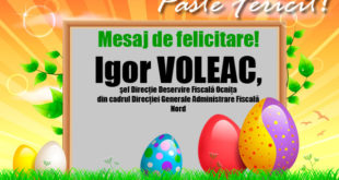 Stimaţi beneficiari! Dragi locuitori ai raionului Ocniţa! Sărbătoarea Invierii Domnului îmi oferă deosebitul prilej de a vă adresa, din toata inima, multă sănătate, putere de muncă şi să vă bucuraţi de aceste binemeritate zile de sărbătoare alături de cei dragi. Fie ca această sărbătoare creştină să vă aducă doar împăcare …